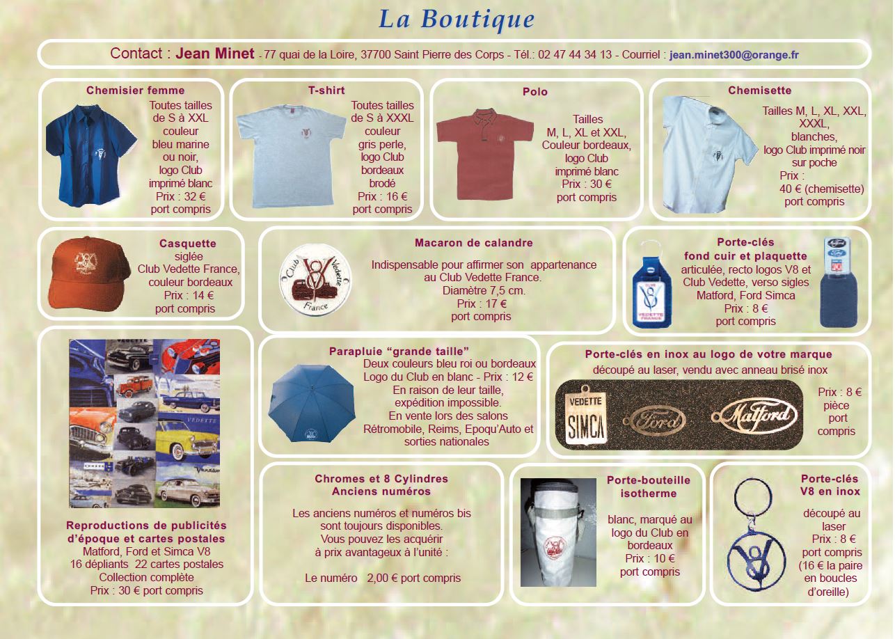 Le Club Vedette France propose dans sa boutique des articles, vêtements et équipements siglés à son logo, mais également des documents de présentation des Vedette, ainsi que les numéros de son magazine « Chromes et 8 Cylindres » depuis l’origine. Vous pouvez découvrir tous nos produits ci-dessous .